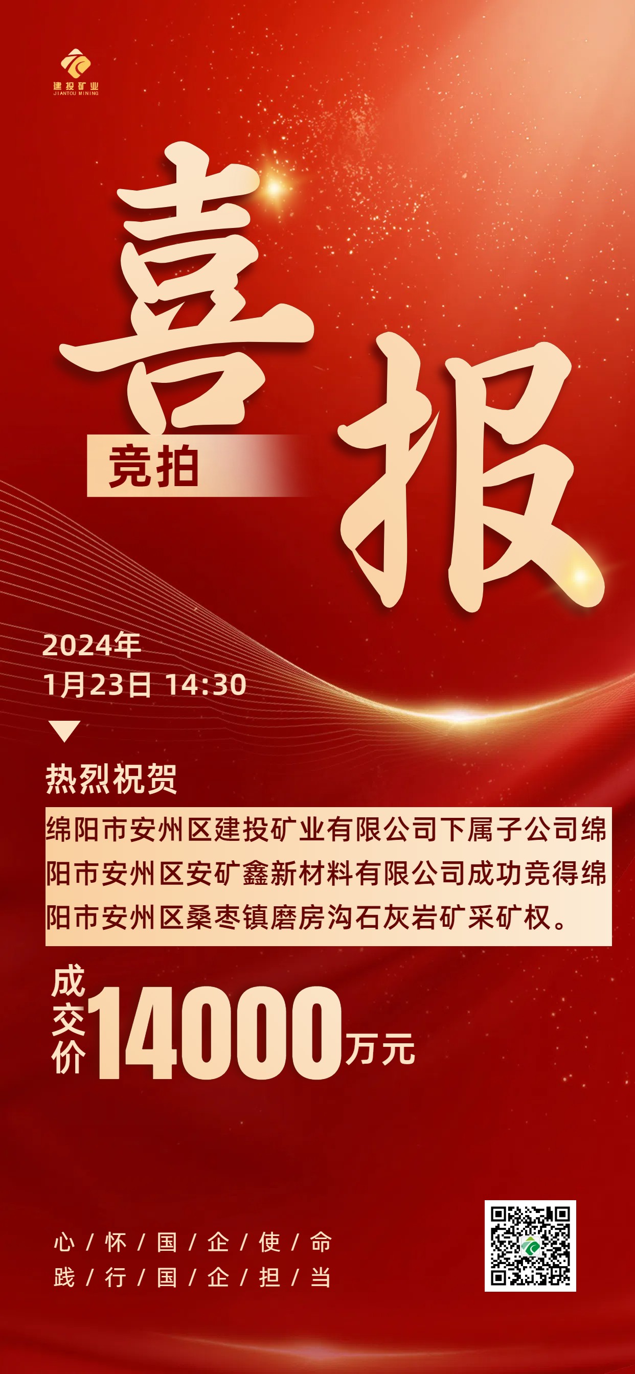 喜報(bào)|綿陽(yáng)安州礦產(chǎn)資源集團(tuán)有限公司下屬子公司綿陽(yáng)市安州區(qū)安礦鑫新材料有限公司成功競(jìng)得綿陽(yáng)市安州區(qū)桑棗鎮(zhèn)磨房溝石灰?guī)r礦采礦權(quán)