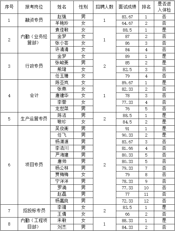 一、面試成績、排名及是否進入體檢
